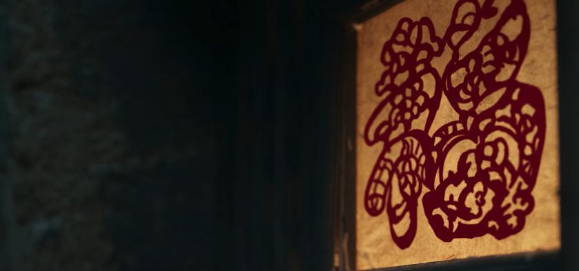 同样是剪纸,绣绣家完全展露出来的福字,不同于苏苏窗户上被框起来的喜字。