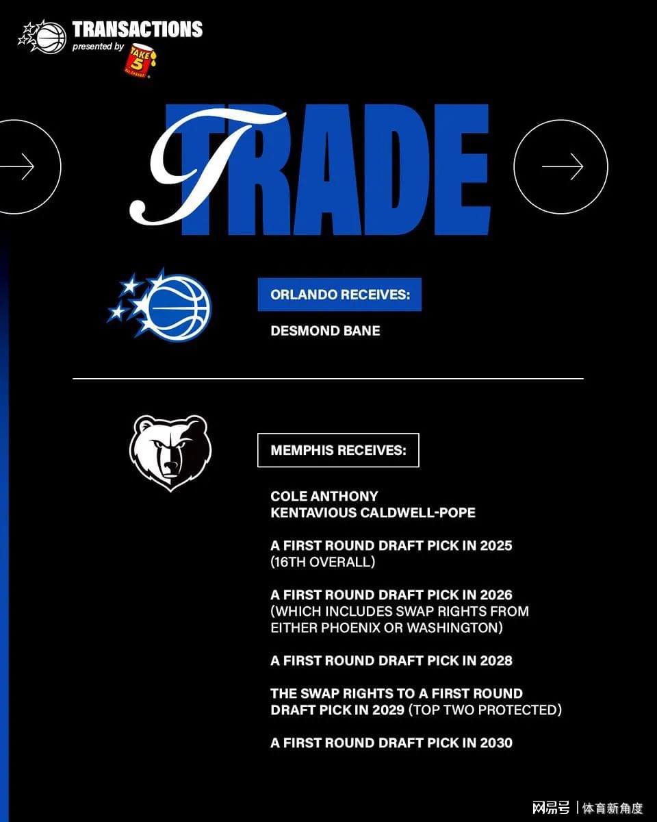 这四个首轮选秀权分别是:2025年的16号签、2026年来自太阳的无保护首轮签(且拥有与奇才互换的选项)、2028年与2030年均来自魔术的无保护首轮签。而那个首轮互换权,则是2029年的,且带有前二顺位保护。如此丰厚的回报,让人不禁感叹贝恩的身价之高昂,甚至有媒体戏言,当魔术提出报价时,灰熊方面一度以为对方志在必得的是他们的当家球星莫兰特。