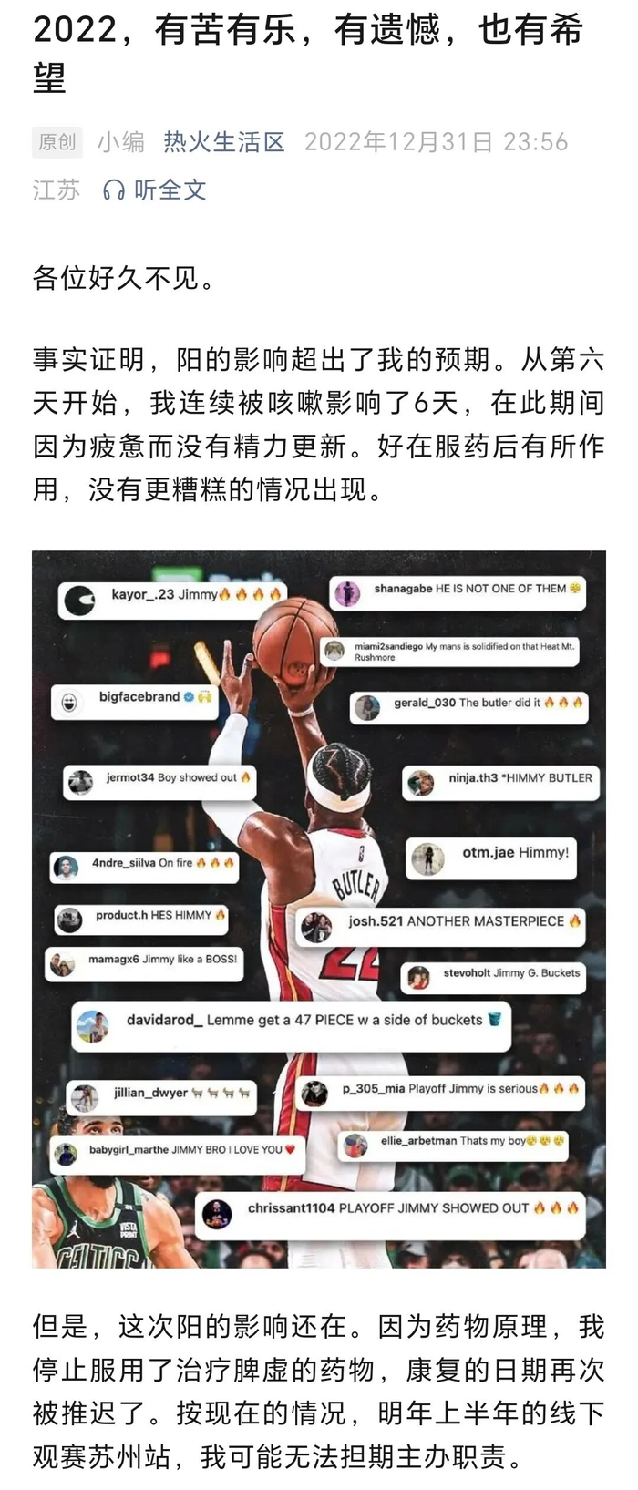 2021-22赛季,阵容更迭的热火强势拿到东部第一,巴特勒仍然是全队最好的那个人;而我也开始有了一些名气,并且对于长期运营热火内容和群体建设事宜有了长远的计划和期待,甚至一度打算举办热火球迷线下观赛活动(我从2019年夏天就开始憧憬这个事情)--因为多重因素,线下观赛活动最终没能成行。