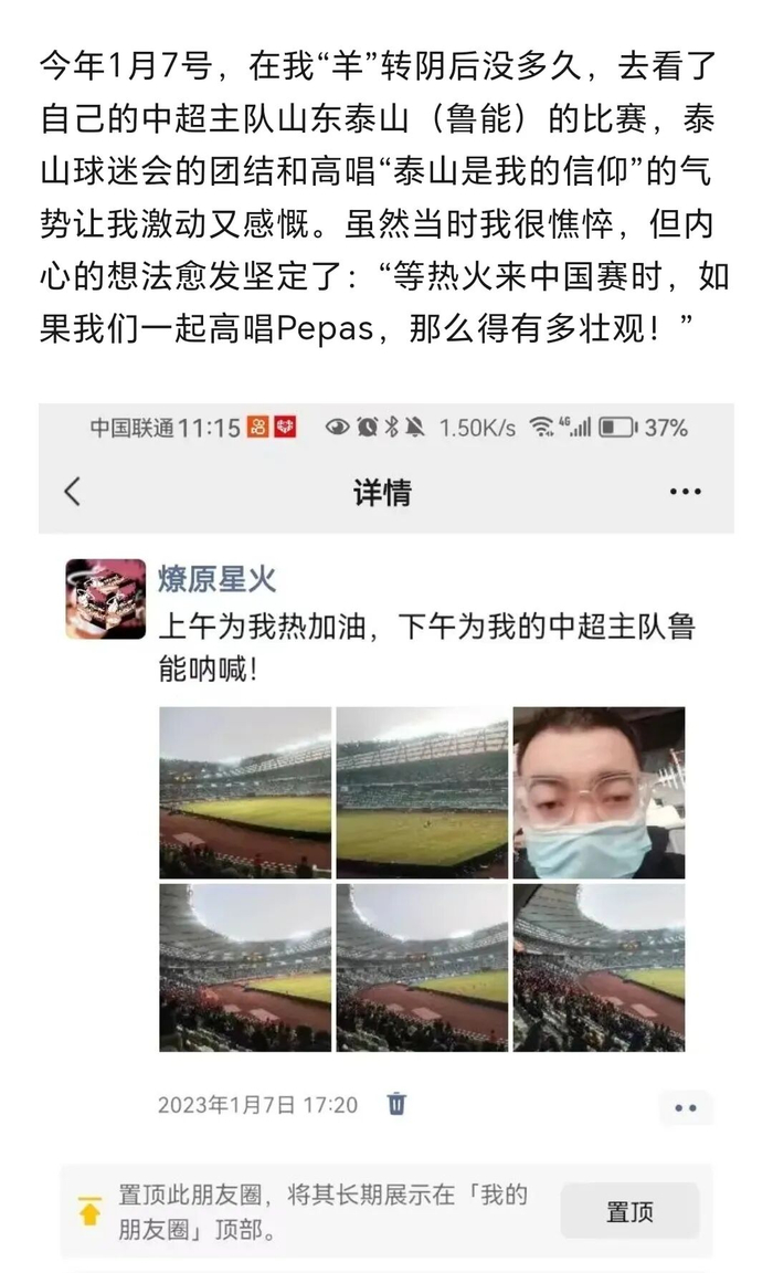 2023年1月7日,我的中超主队山东泰山因为参加足协杯比赛来到苏州,身体还很虚弱的我最终决定前往现场观赛: