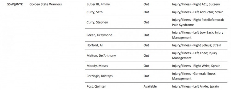 勇士今日伤兵满营,库里、巴特勒、 波尔津吉斯、梅尔顿、穆迪、追梦、霍福德和赛斯·库里8名大将全部缺战。
