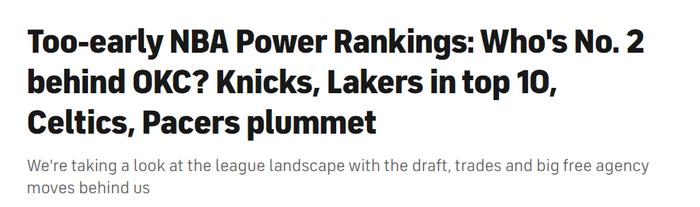 CBS更新休赛期30队实力榜:雷霆居首火箭第4 湖人第8开拓者第21